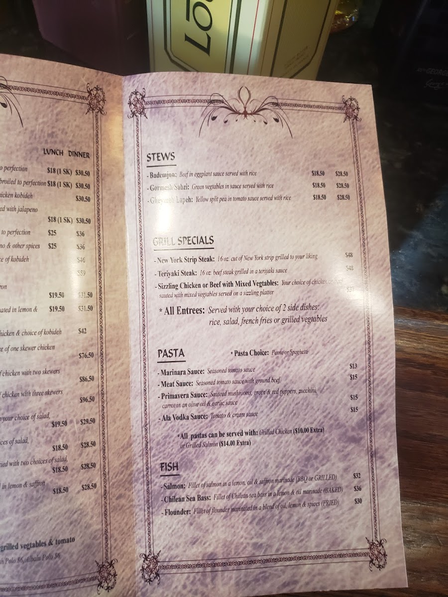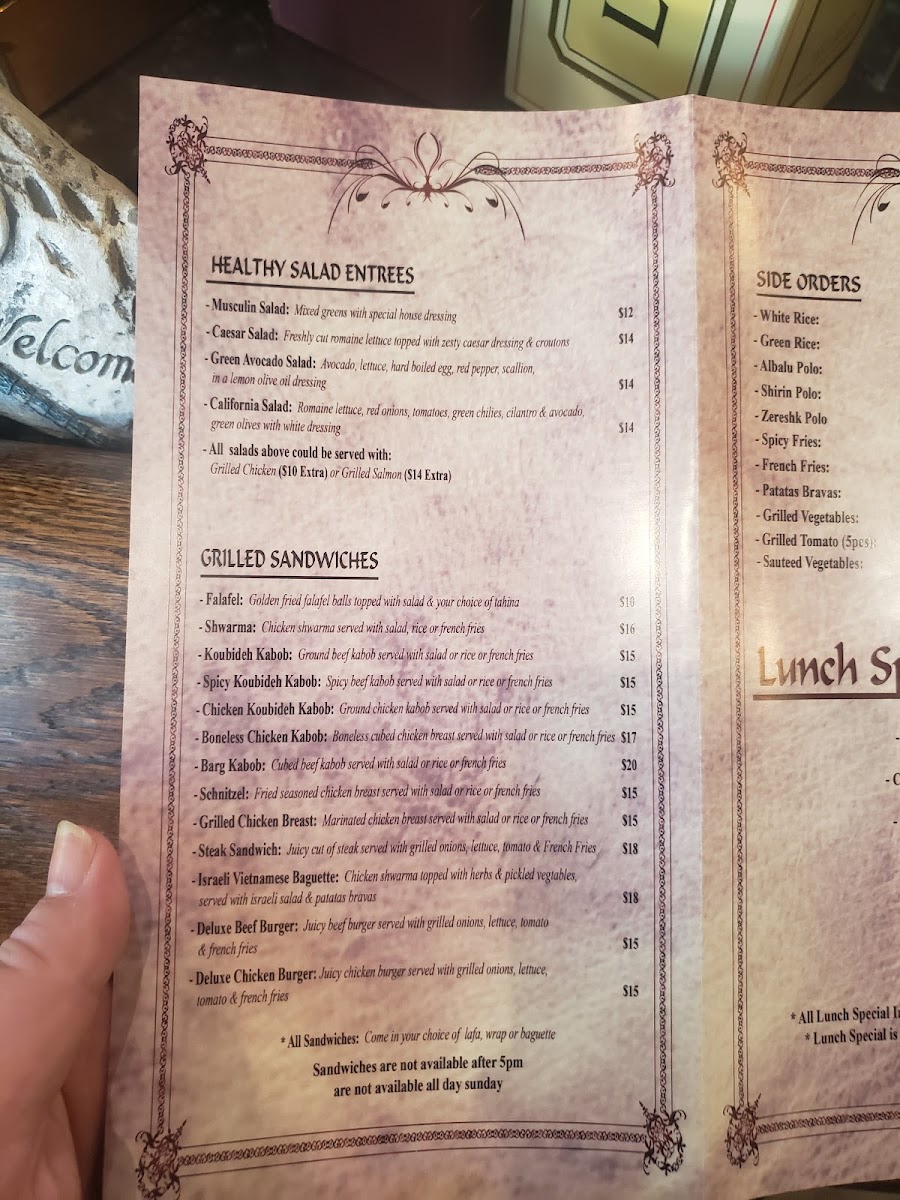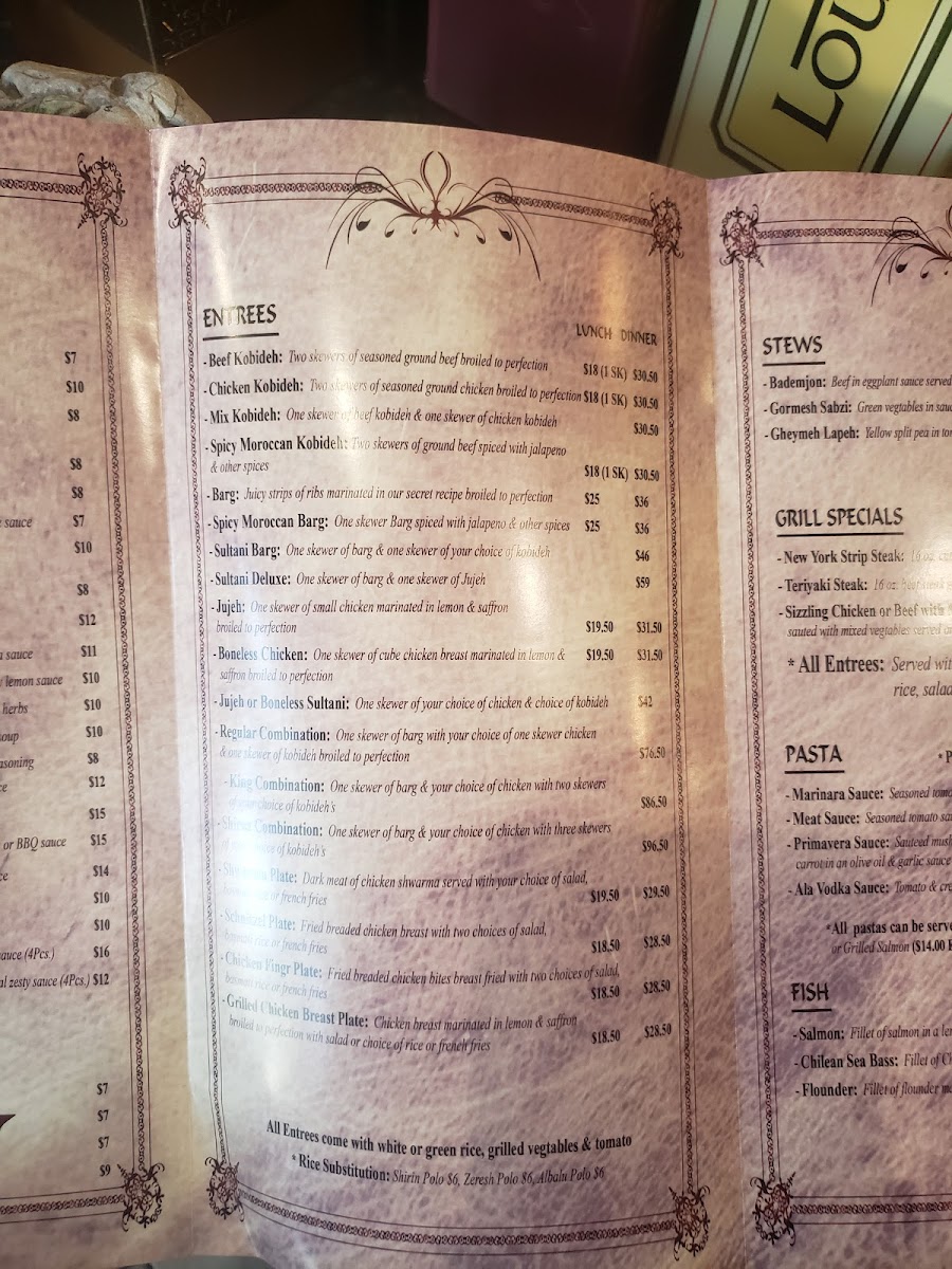 Highlights include hearty options like Sultani Barg and Lamb Chops, flavorful soups such as Ash Reshteh, and satisfying wraps served throughout the day as part of convenient lunch specials. The menu also accommodates lighter tastes with fresh salads and combos featuring staples like Dolmeh Ghondi and Tabouli. Pair your meal with refreshing drinks like a well-crafted Mojito or choose from a selection of wines to complement the rich flavors.